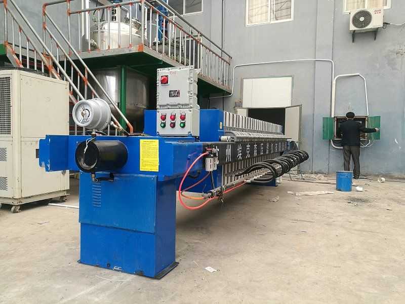 液壓廂式壓濾機由交替排列的濾板和濾框構(gòu)成一組濾室。濾板的表面有溝槽,其凸出部位用以支撐濾布。濾框和濾板的邊角上有通孔,組裝后構(gòu)成完整的通道,能通入懸浮液、洗滌水和引出濾液。板、框兩側(cè)各有把手支托在橫梁上,由壓緊裝置壓緊板、框。板、框之間的濾布起密封墊片的作用。由供料泵將懸浮液壓入濾室 在濾布上形成濾渣,直至充滿濾室。濾液穿過濾布并沿濾板溝槽流至板框邊角通道,集中排出。過濾完畢,可通入清洗滌水洗滌濾渣。