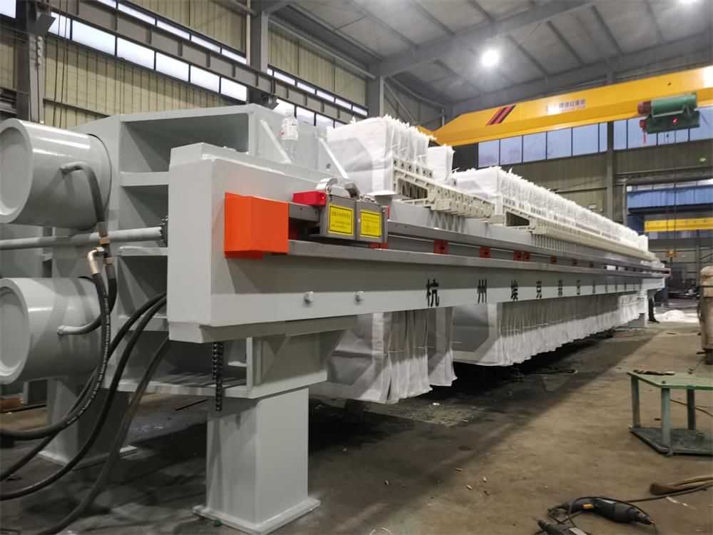 隔膜壓榨壓濾機是由隔膜板和廂式濾板排列組成濾室,在輸料泵的壓力作用下將料漿輸入濾室,通過過濾介質(zhì)(濾布)將料漿中的固體和液體分離,當(dāng)料漿中的固體形成餅后,再向隔膜通入空氣,對濾室內(nèi)的固體充分壓榨。